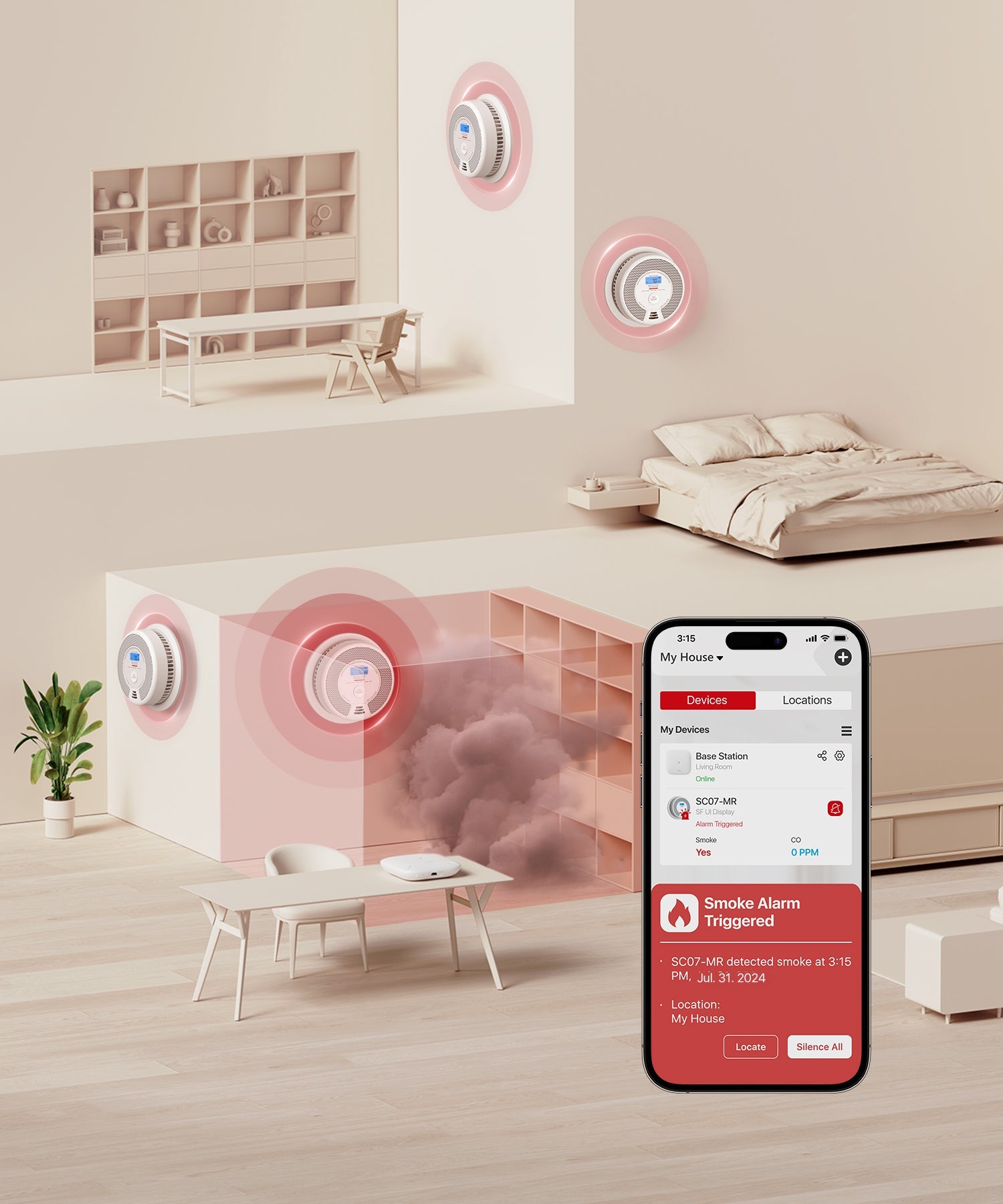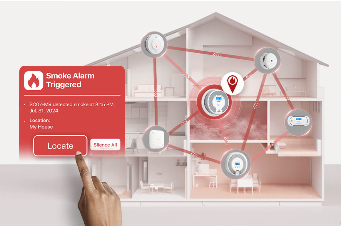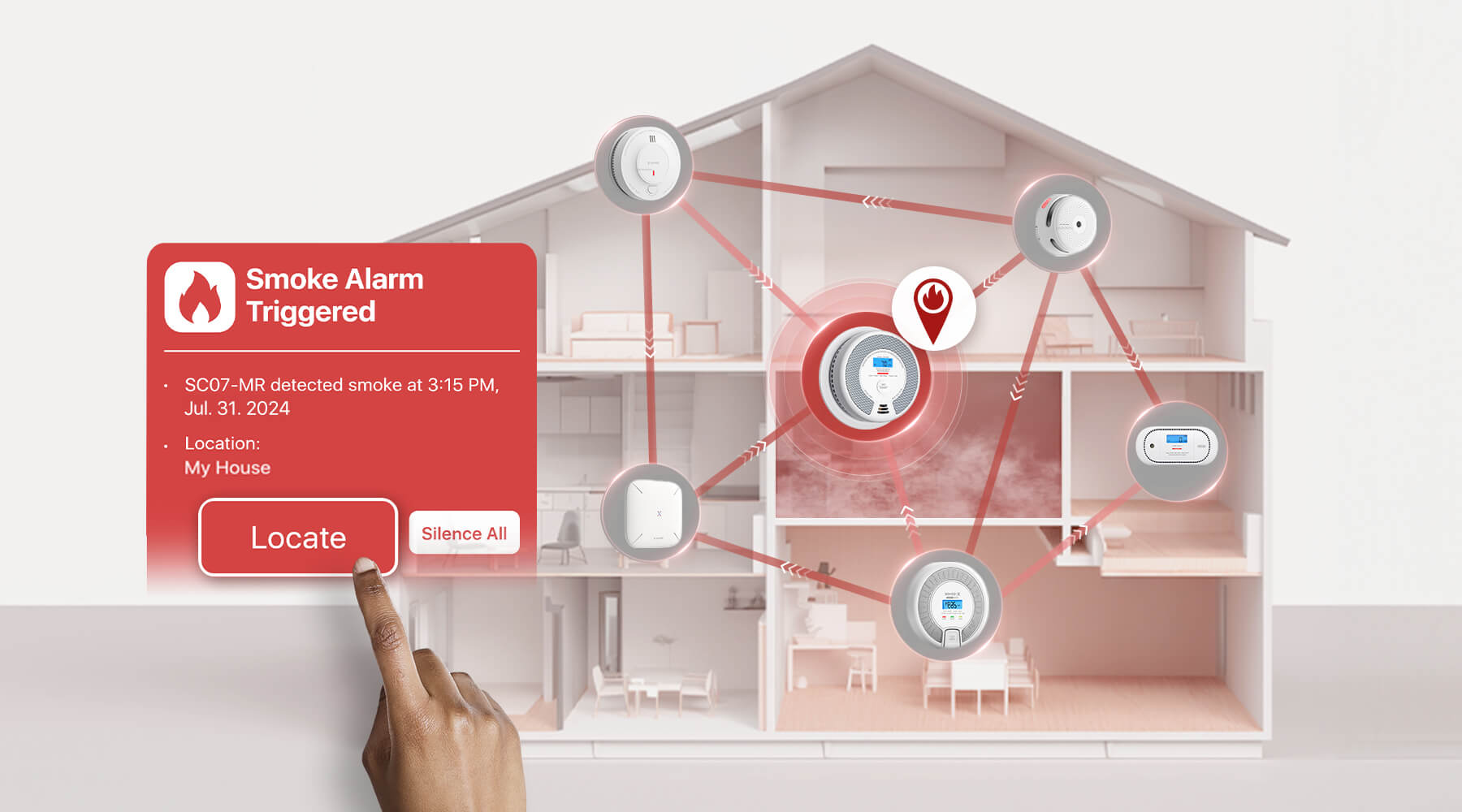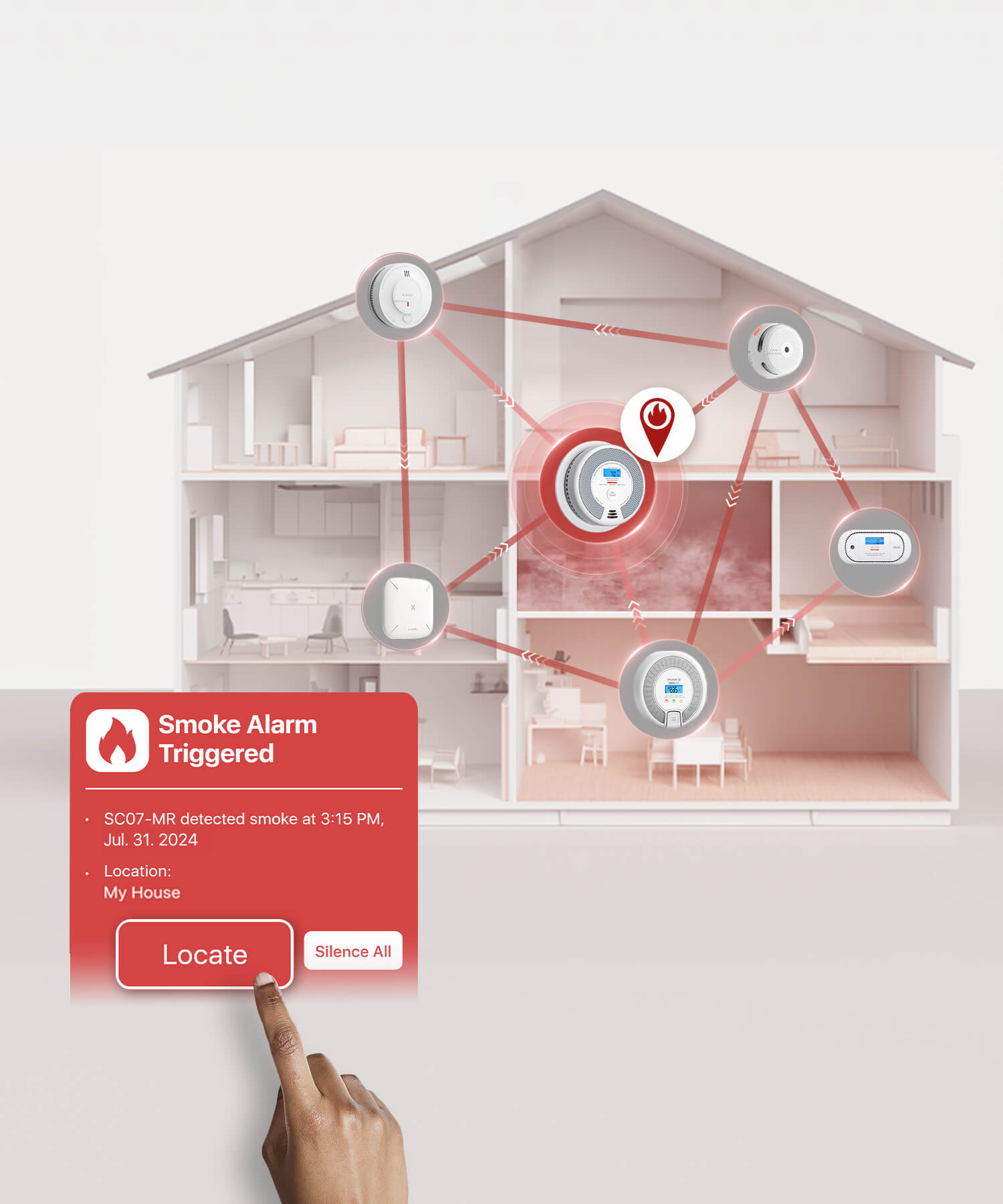 All connected SC07-MR alarms sound simultaneously when one detects a threat, ensuring the alarm is heard throughout your home, and everyone can react quickly to potential dangers.