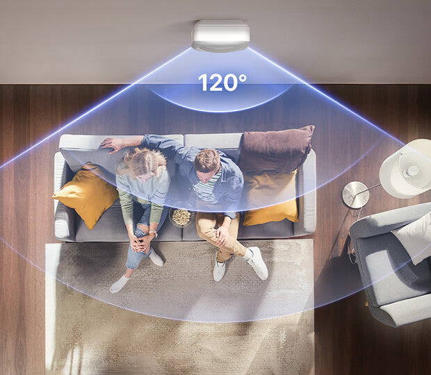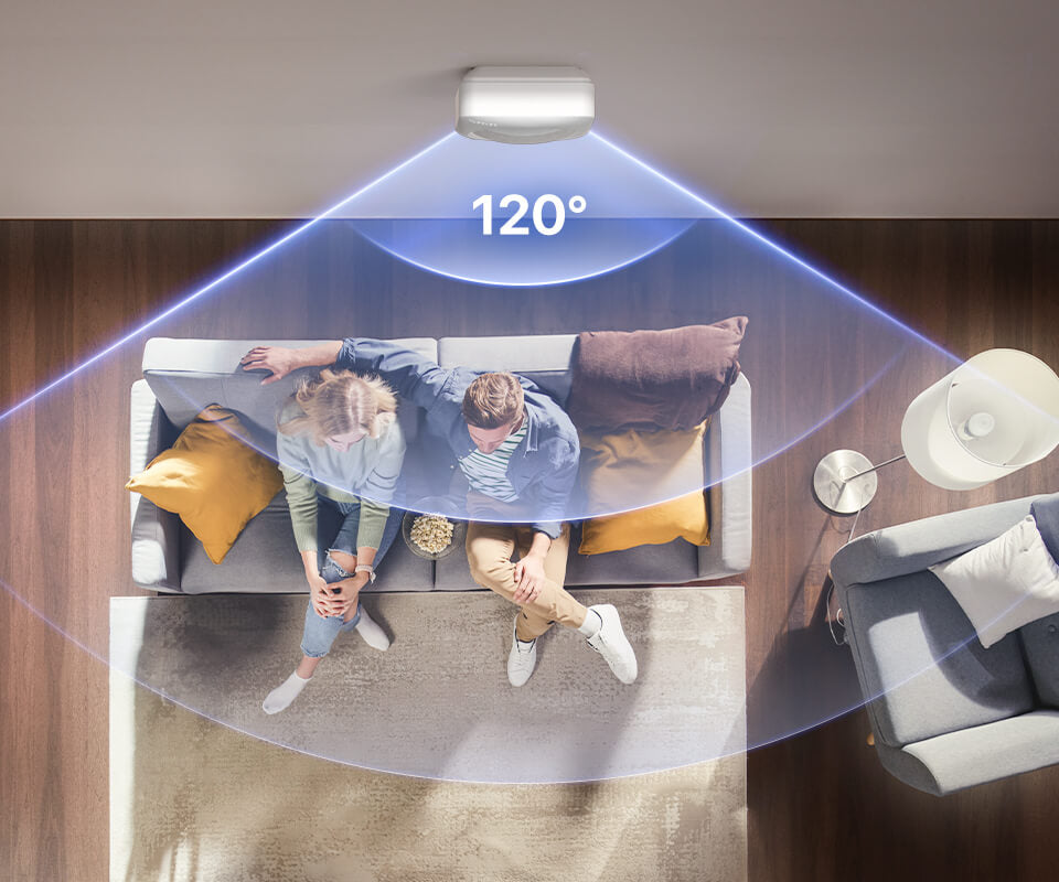 The motion sensor, mountable on walls or corners, detects movement within a 26-40 foot range and a 120-degree angle, adjustable to indoor settings. It sends instant push notifications and allows access sharing for remote monitoring of unauthorized activity.