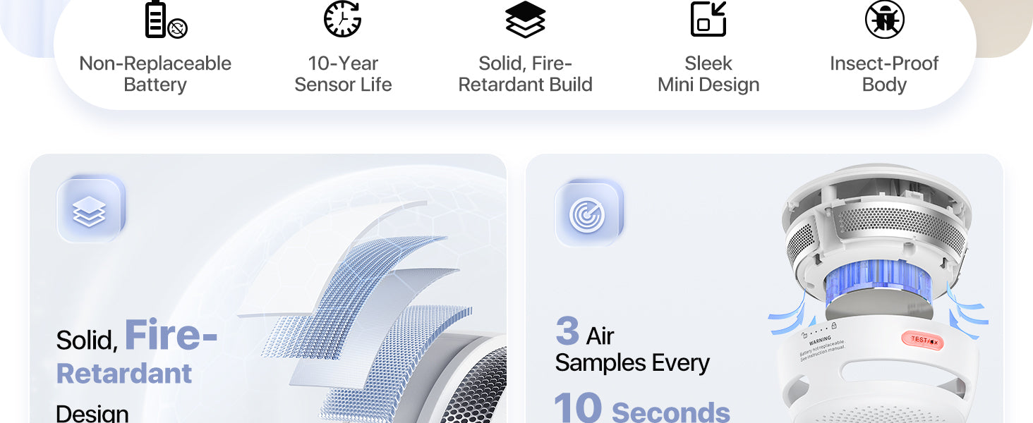 The X-Sense XS01 Smoke Alarm is designed for efficiency and safety, featuring a 10-year battery life, easy installation, and a compact design for enhanced smoke detection. It includes a low battery warning, an insect-proof design, and a loud 85 dB buzzer. Made from durable, corrosion-resistant, and flame-retardant materials, ensuring reliable protection and peace of mind for your family.